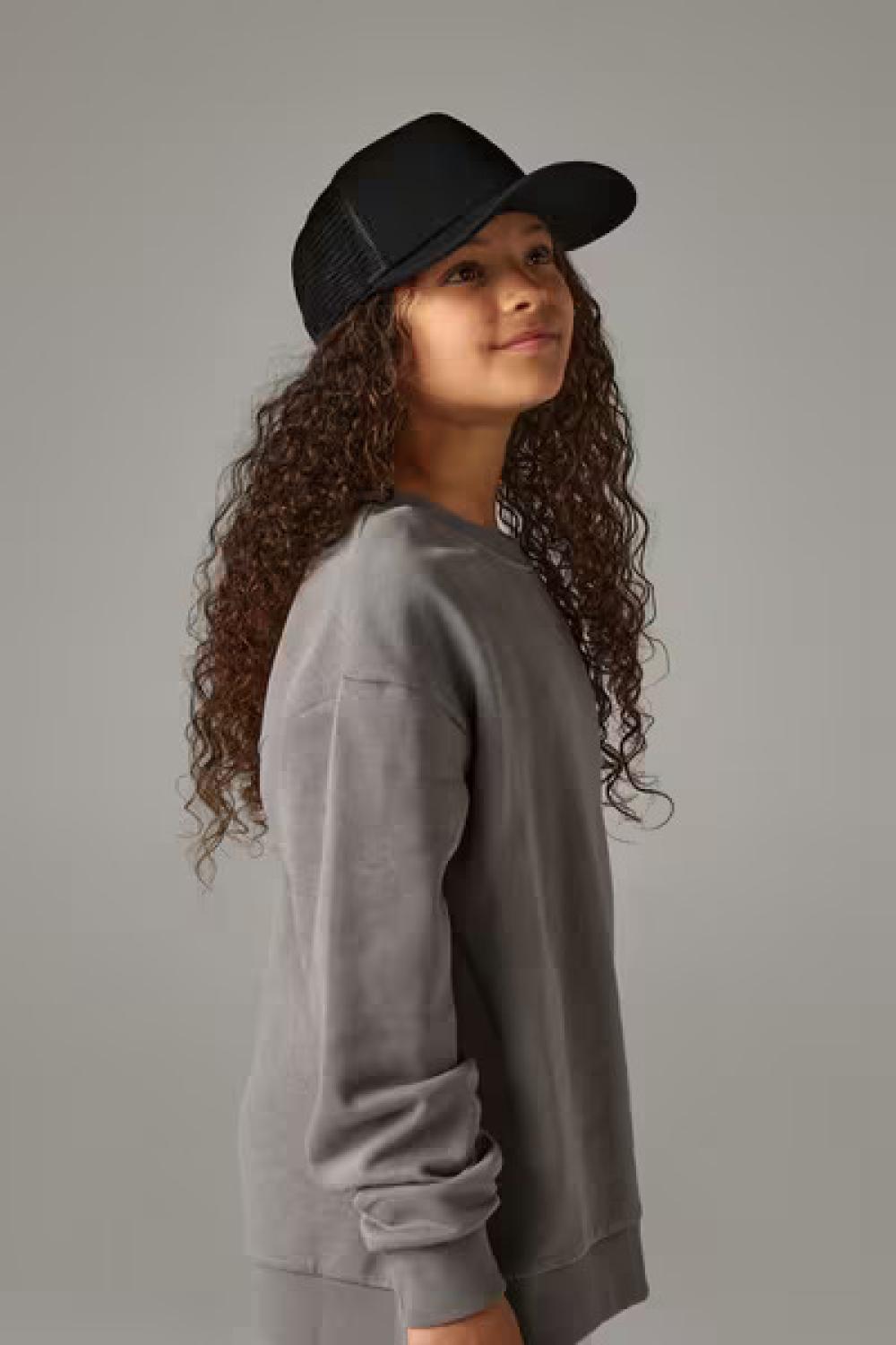 Gorra de rejilla para niño con visera plana, estilo snapback. Ajustable a diferentes tamaños, con panel frontal y visera totalmente acolchados. Perfecta para impresión o bordado, combina comodidad y estilo clásico.