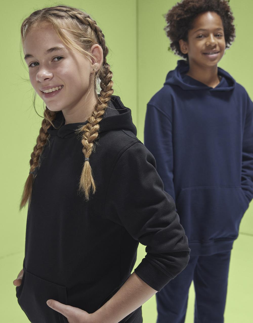 Sweat-shirt enfant unisexe à capuche de 280 g/m², en coton et polyester recyclé, doux et résistant.