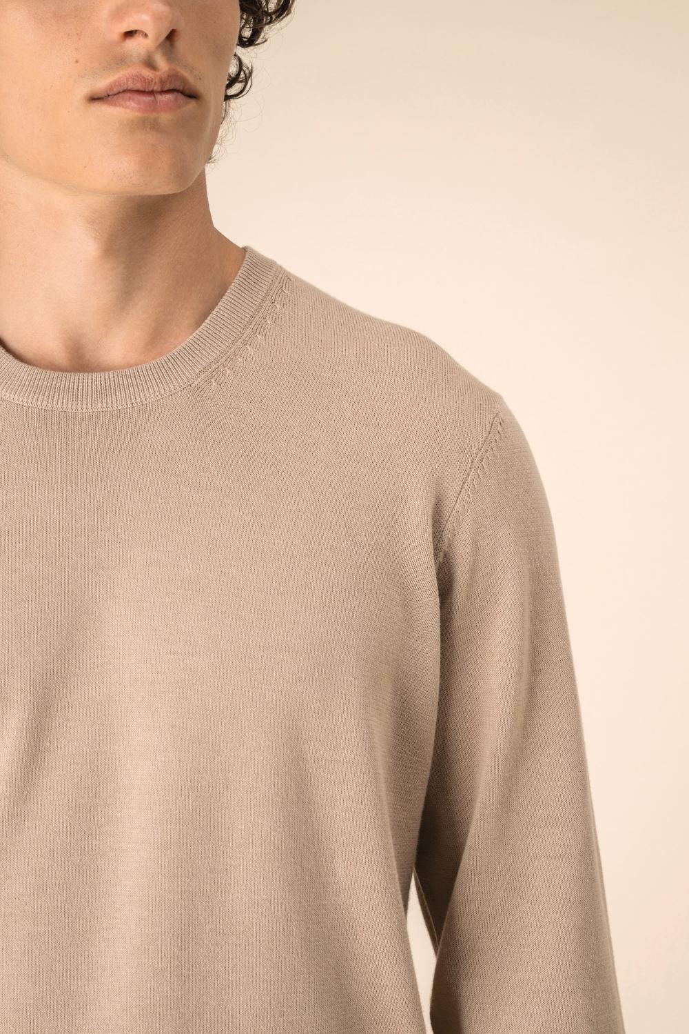 Camisola tricotada em algodão biológico 100% penteado, com malha fully de calibre 12 para um acabamento premium e ajuste preciso. De corte direito, apresenta decote, punhos e bainha em malha rib 1x1, garantindo conforto e durabilidade. O tratamento antiborboto preserva o aspeto original ao longo do tempo. Inclui tapa-costuras interior no mesmo material, tom sobre tom. É ideal para um look elegante e sustentável.